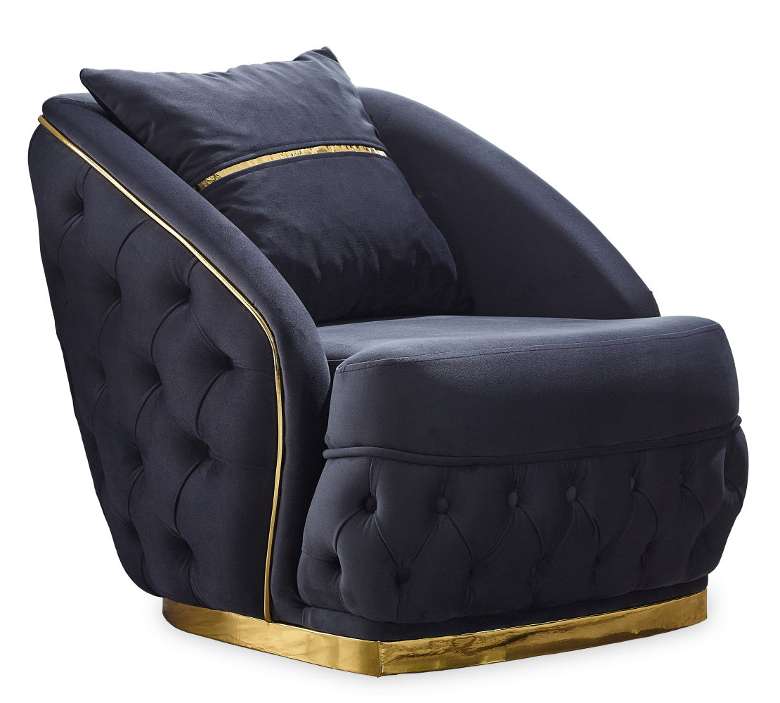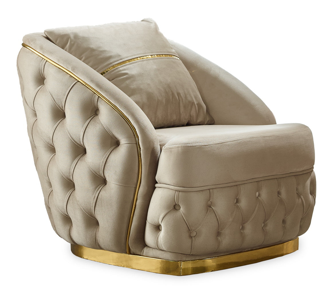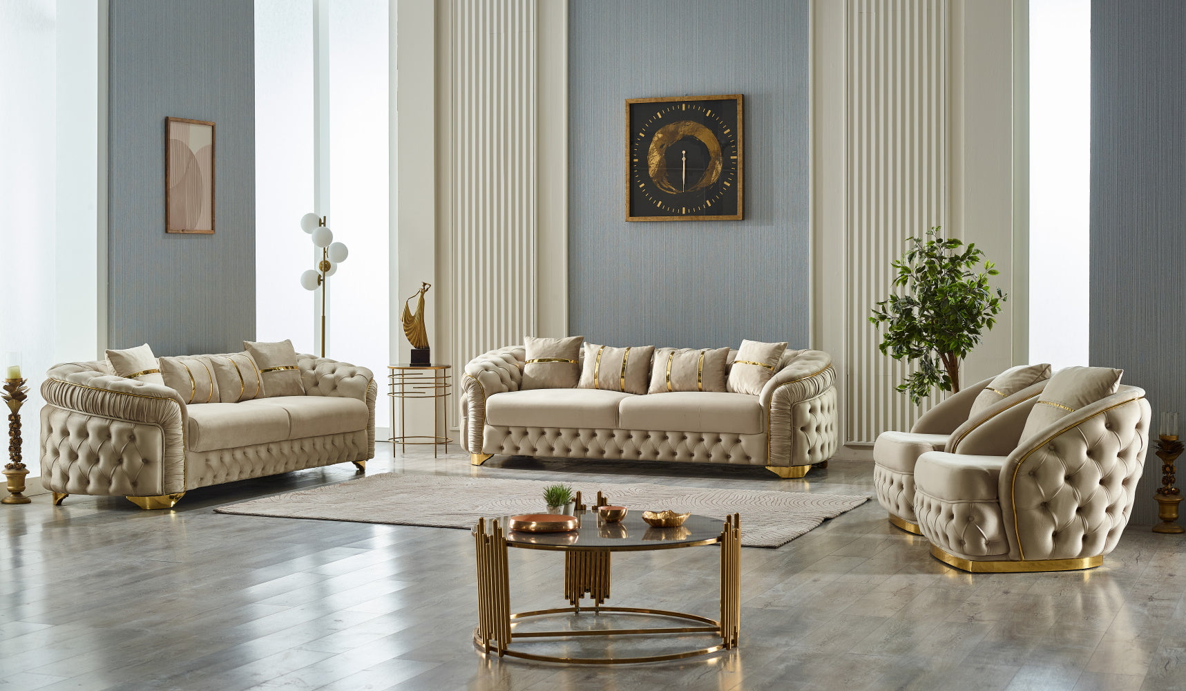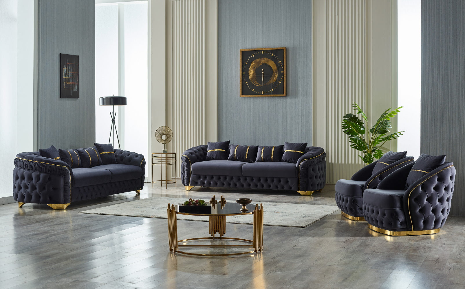 Arizona Sofa Set combines classic chester design with modern elements, offering a luxurious atmosphere with its gold metal legs and gold ribbon details. This sofa set aims to make your living spaces special by merging aesthetics and comfort.