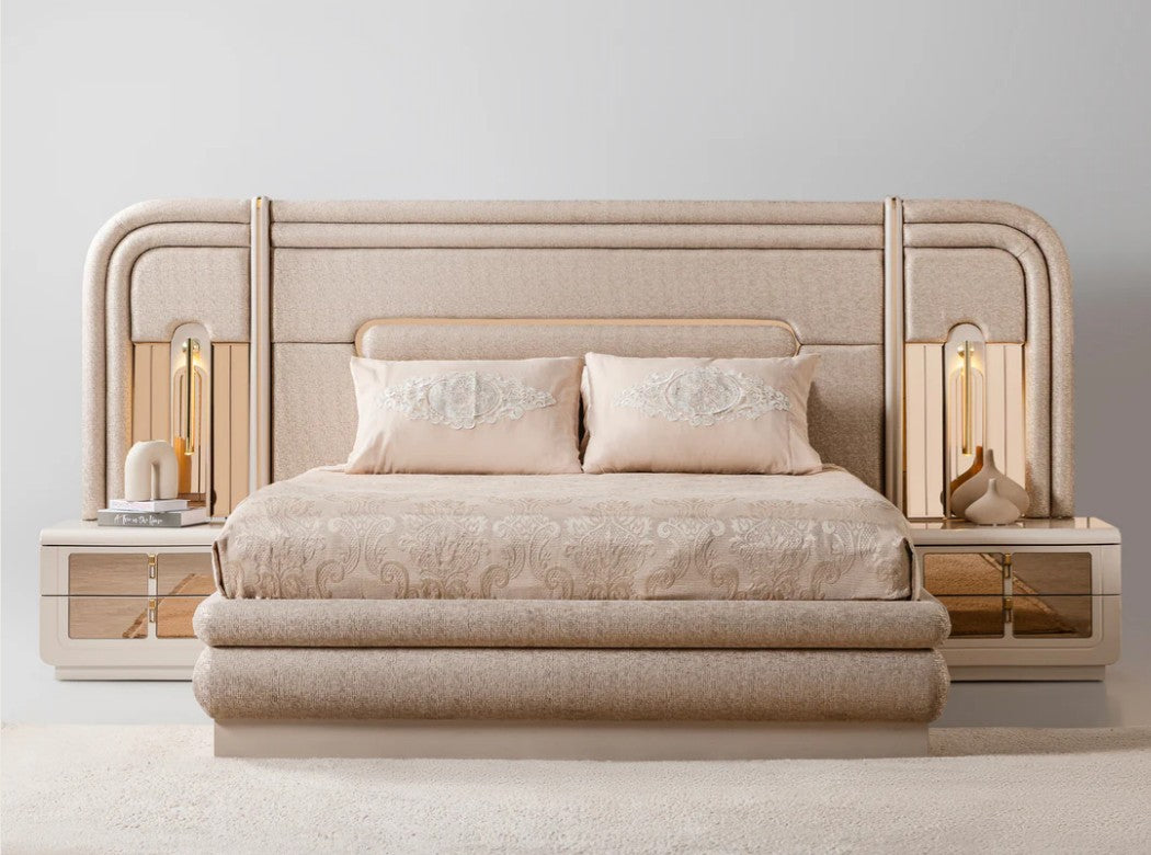 harmoniously crafted nightstands, each adorned with polished gold hardware