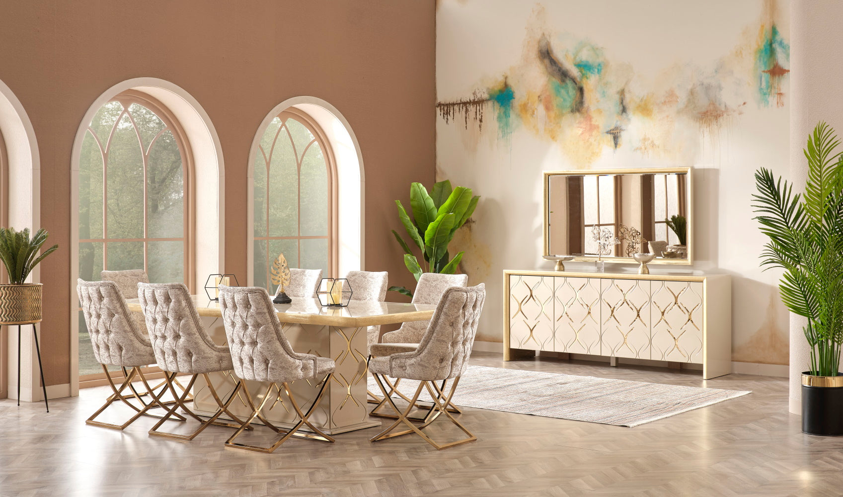 Napoli Dining Room Set is an exquisite collection designed, drawing inspiration from the unique atmosphere of the city of Naples, bringing together aesthetics and comfort marvelously. With its gold details and unique design, this set adds a sophisticated touch to your living space.