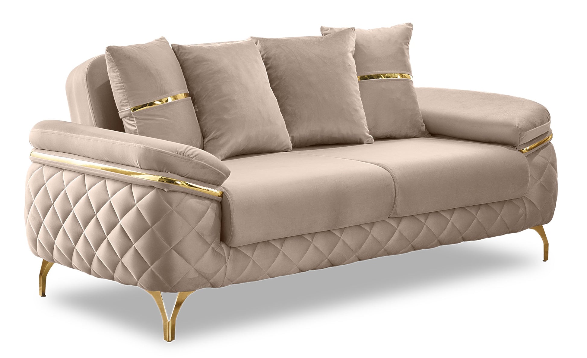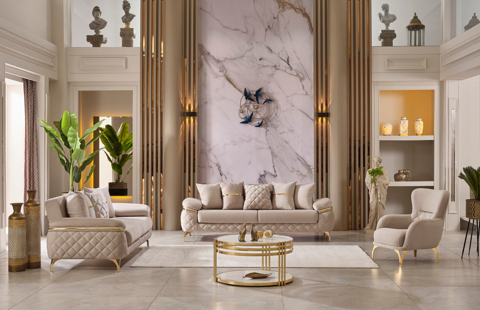 The specially designed metal base, highlighted by its eye-catching gold color, enhances the overall elegance. Gold accents on the arm details further emphasize its sophistication. The stitched fabric structure on the armrests not only provides an aesthetic look but also ensures durability; these details contribute to the refined character of the sofa set.