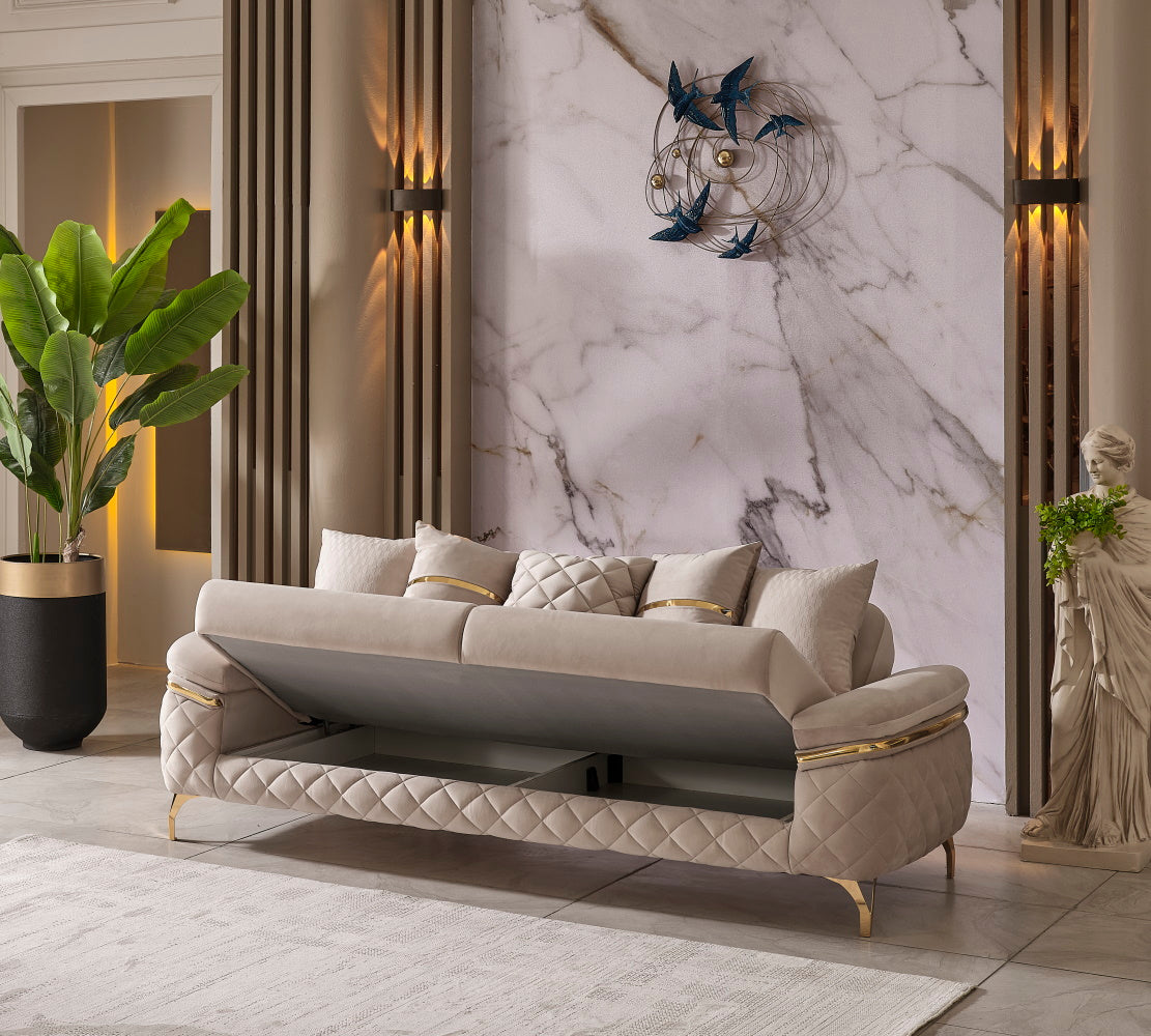 Orlando sofa set is a unique product designed to bring elegance and functionality to your modern living spaces. With its pull-out bed feature, it offers a practical solution for accommodating guests, while the spacious storage area helps you organize your home effortlessly.