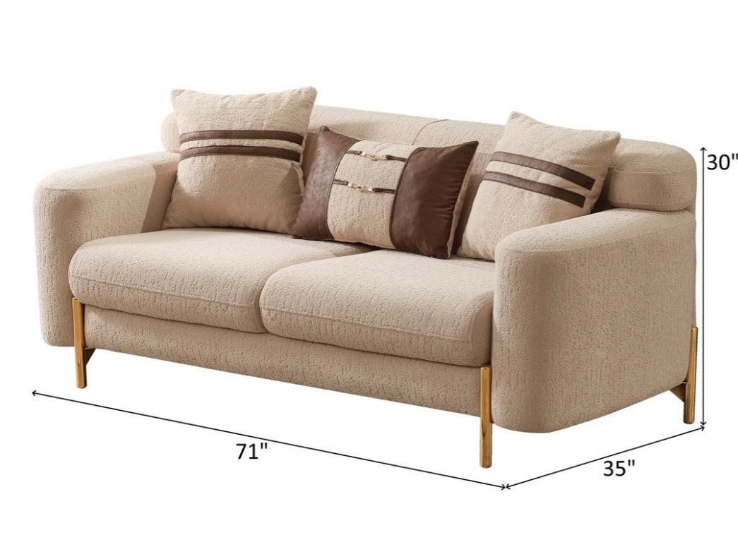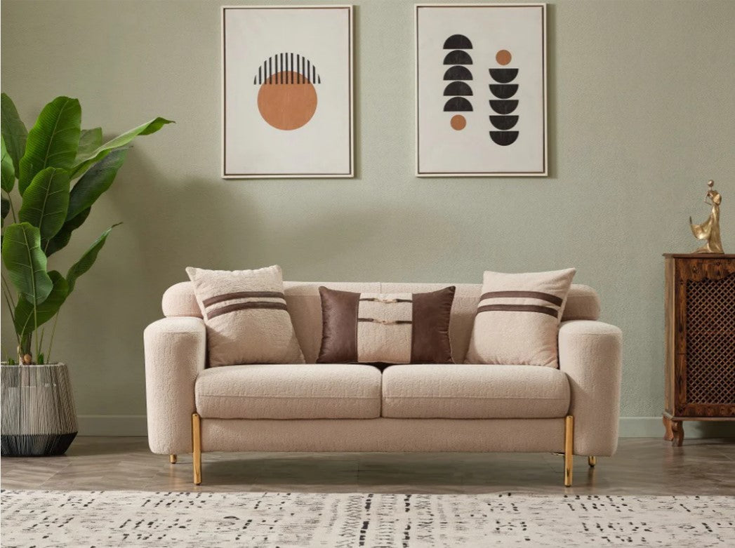 The minimalist design of the Shelby sofa set harmonizes beautifully with various decor styles. It can be seamlessly integrated into modern, classic, or bohemian-themed spaces. The sleek lines and elegant gold legs add a touch of sophistication to the environment while also creating a spacious look. This sofa set brings a luxurious feel to any living area, creating a visually striking atmosphere.